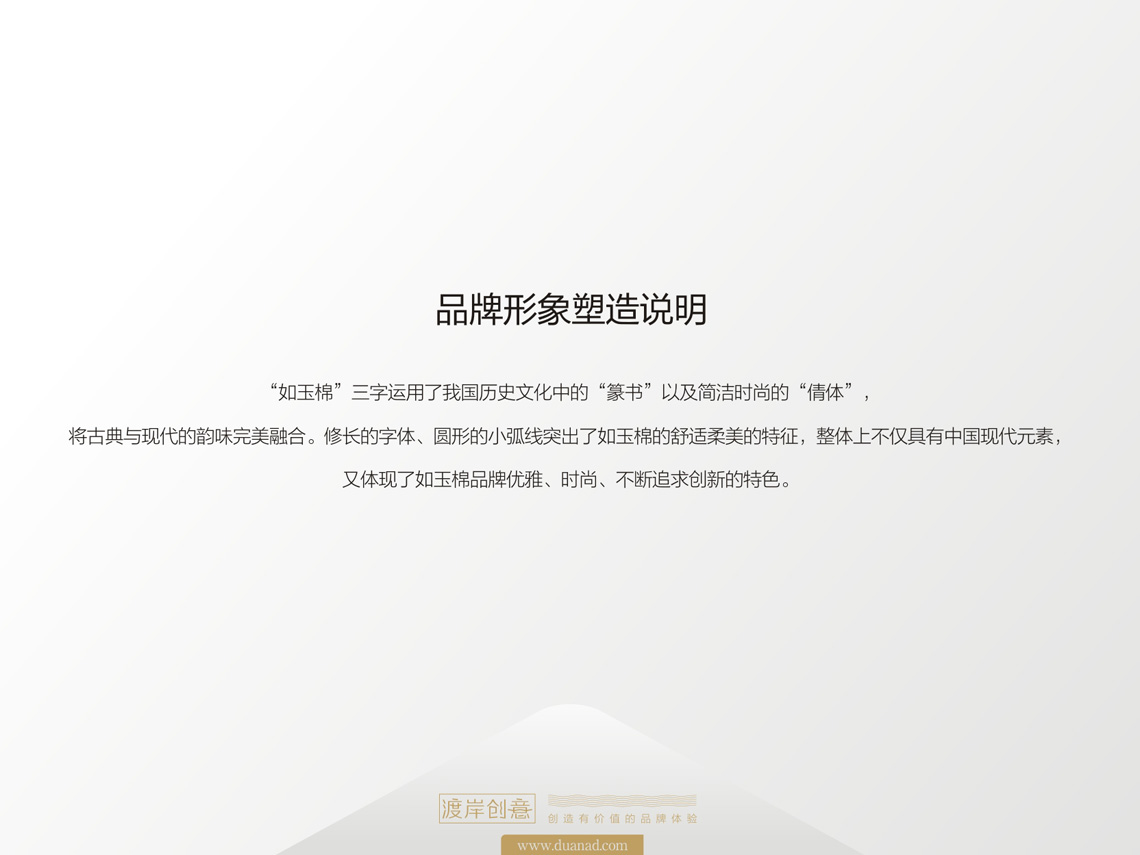 LOGO運(yùn)用了我國歷史文化中的“篆書”以及簡潔時(shí)尚的“倩體”,將古典與現(xiàn)代的韻味完美融合。修長的字體、圓形的小弧線突出了如玉棉的舒適柔美的特征,整體上不僅具有中國現(xiàn)代元素,又體現(xiàn)了如玉棉品牌優(yōu)雅、時(shí)尚、不斷追求創(chuàng)新的特色。