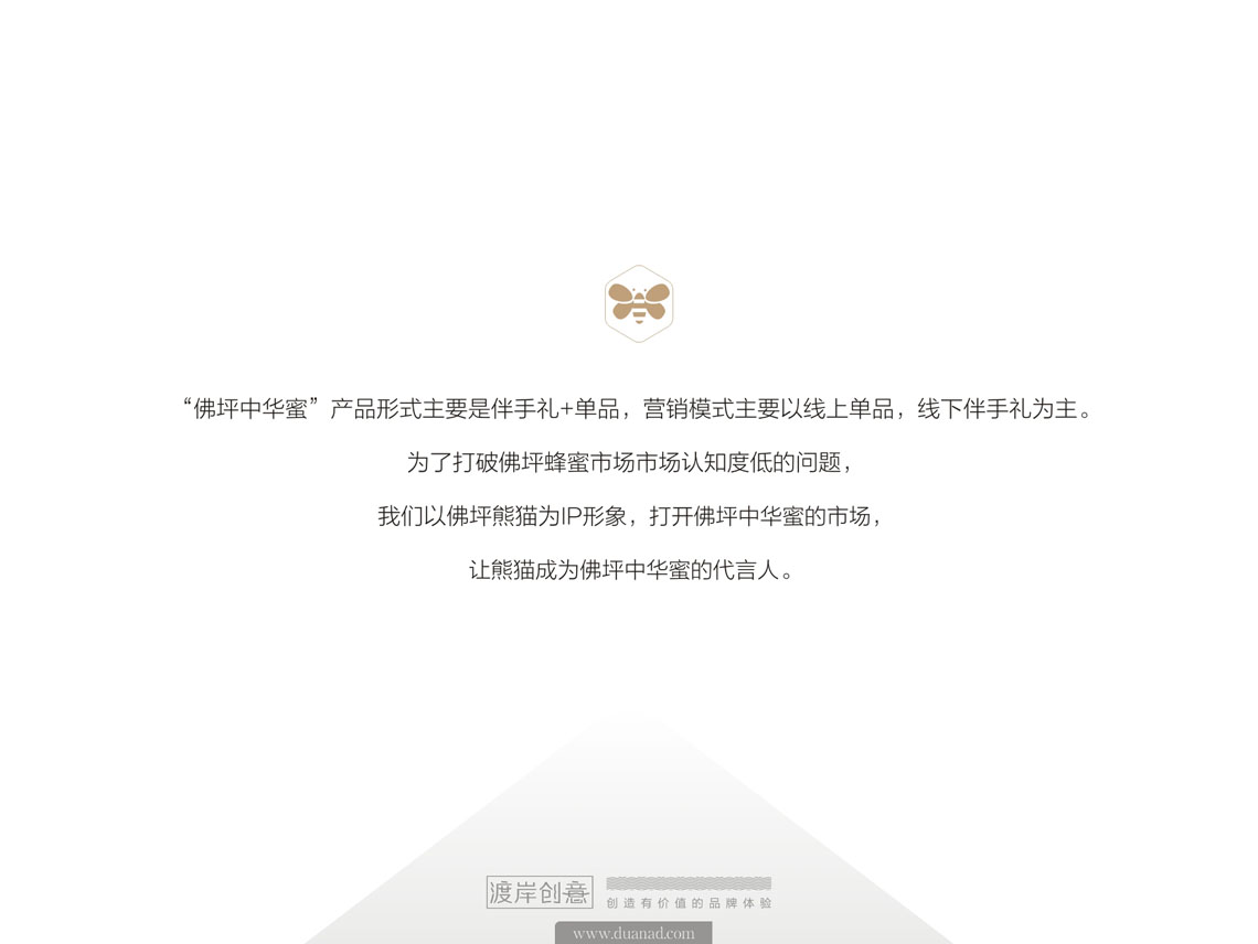 “佛坪中華蜜”產(chǎn)品形式主要是伴手禮+單品,營(yíng)銷(xiāo)模式主要以線(xiàn)上單品,線(xiàn)下伴手禮為主。為了打破佛坪蜂蜜市場(chǎng)市場(chǎng)認(rèn)知度低的問(wèn)題,我們以佛坪熊貓為IP形象,打開(kāi)佛坪中華蜜的市場(chǎng),讓熊貓成為佛坪中華蜜的代言人。