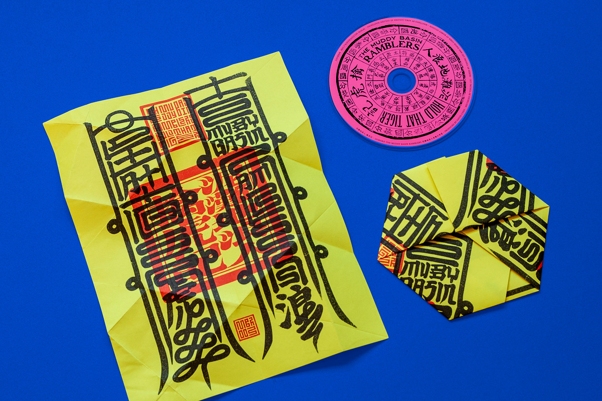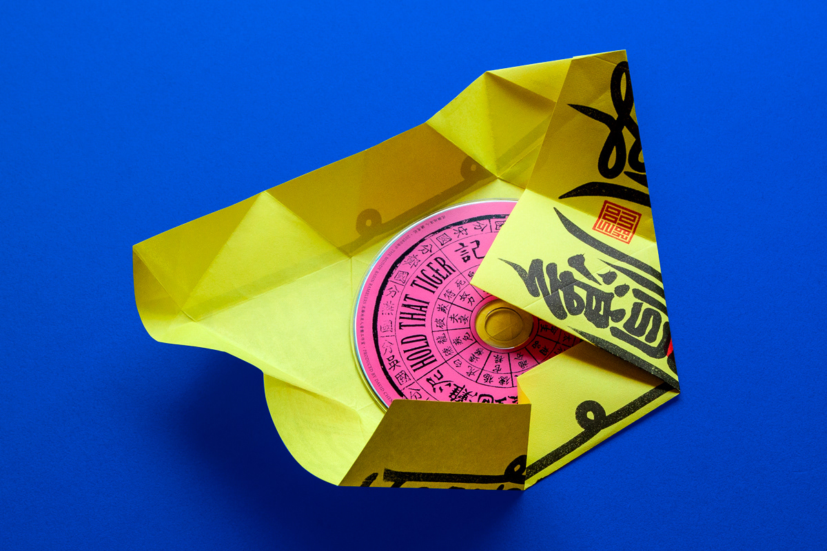 依據(jù)藝術(shù)家徐冰「新英文書法」,將英文Typography加上漢字構(gòu)成右側(cè)樂團(tuán)名 (The Muddy Basin Ramblers) 與左側(cè)專輯名 (Hold That Tiger),再造似字非字、似圖非圖的畫符美感,放大版的平安符由8道步驟摺為六角平安符並包裹光碟。