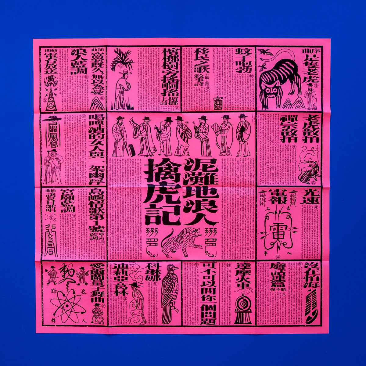 擒虎記,源自一首古老的爵士經(jīng)典《Tiger Rag 老虎散拍》,相傳由美國紐奧良非裔爵士樂手於1905所創(chuàng),1918卻被白人組成的爵士樂團(tuán),錄音發(fā)行並剽竊了版權(quán)所有。藉樂史事件切題發(fā)揮,視覺也悄悄地「剽竊」了民俗信仰中的文化元素,專輯中的所有物件,彷彿廟宇中發(fā)予信眾的勸世刊物,仔細(xì)窺探卻發(fā)現(xiàn)事實並非如此單純。