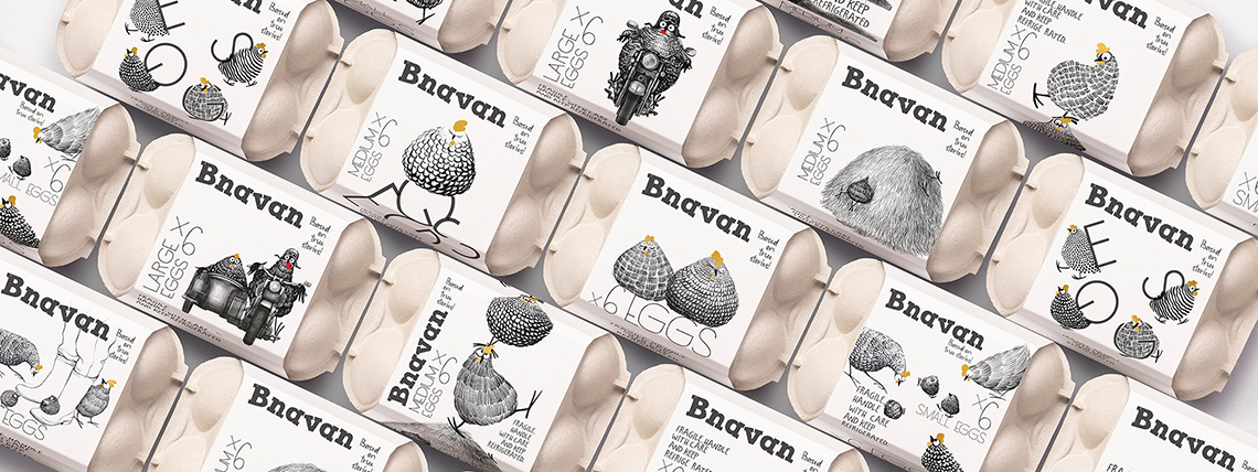 Bnavan蛋類(雞蛋、鵪鶉蛋)包裝設(shè)計,將雞或鵪鶉的形象通過繪畫、黑白色形式表現(xiàn),狀態(tài)擬人化、且惟妙惟肖。瞬間變得可愛。
