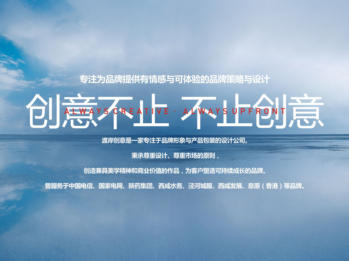 渡岸創(chuàng)意是一家專注于品牌形象與產(chǎn)品包裝的設(shè)計公司。秉承尊重設(shè)計、尊重市場的原則,創(chuàng)造兼具美學(xué)精神和商業(yè)價值的作品,為客戶塑造可持續(xù)成長的品牌。曾服務(wù)中國電信、國家電網(wǎng)、陜藥集團、西北有色金屬、西咸水務(wù)、涇河城服、西咸發(fā)展、息原(香港)等品牌。