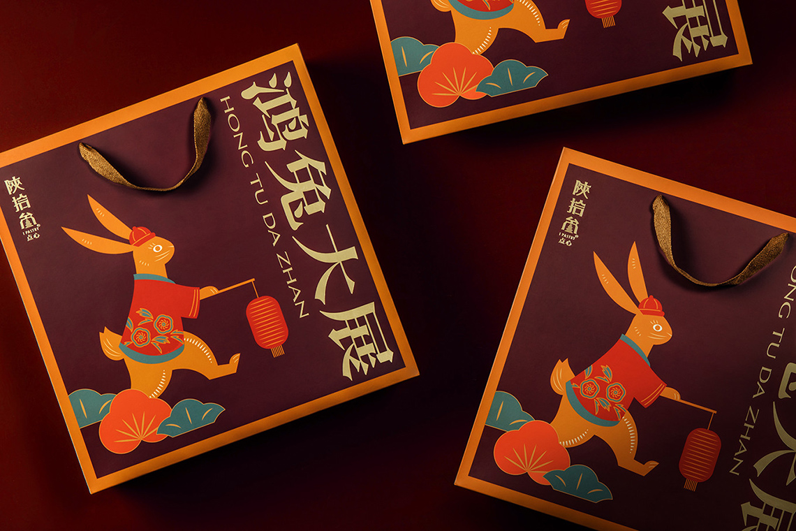 以橘紅色為基底的外盒設(shè)計(jì),透出滿滿的暖意與喜氣,數(shù)字五有著福的諧音,也包含圓滿的含義,五只免子穿著可愛服飾,扛著五財(cái)敲鑼打鼓的前進(jìn),加上五入的內(nèi)裝,代表此禮蘊(yùn)含著(送禮送五入,五路財(cái)神入厝住,)的吉祥之意的背景以線性與色彩的局次堆疊,表現(xiàn)出新年的順風(fēng)順?biāo)?,加上以陜西?dú)特文化的剪船藝術(shù)風(fēng)格刻畫的福免,充滿著喜氣陜西風(fēng)格新年禮盒,愿新的一年,你我都錢兔似錦、鴻兔大展,癸卵兔新年快樂!